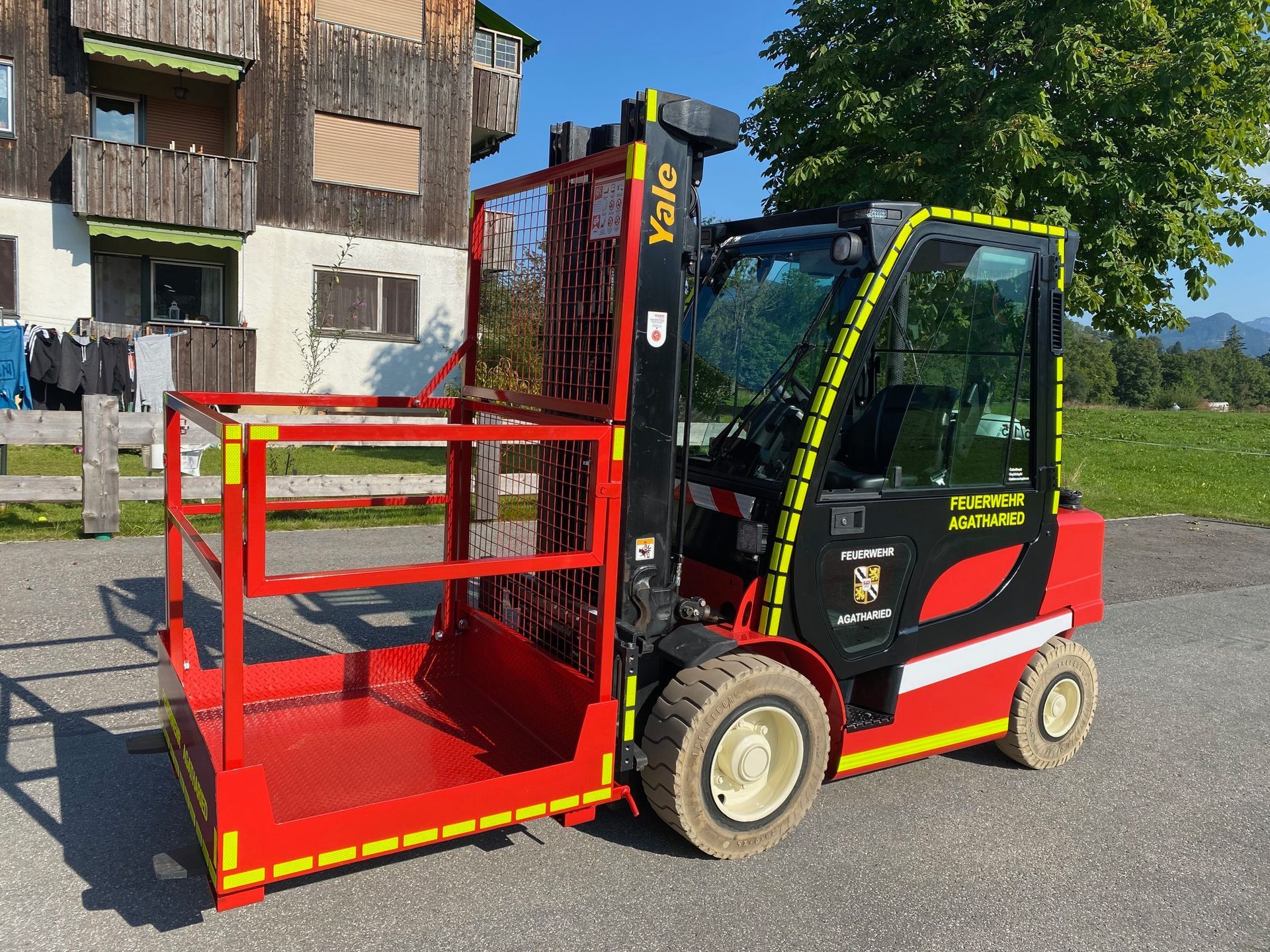 Unser Gabelstapler dient zum Einsatzmittel- und Materialtransport rund um das Feuerwehrhaus. Dank seiner großen Hubhöhe von 5m können mit ihm auch höhere Lagerräume angefahren werden.